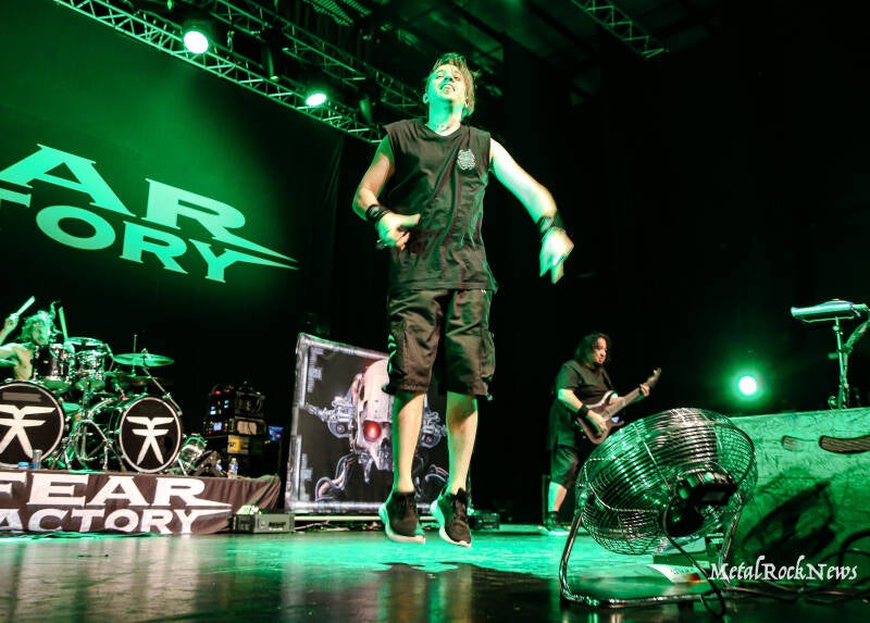 La pause terminée, la suite sera à la hauteur de ce début de soirée ; c'est Fear Factory qui va la clôturer dans une ambiance qui ne retombera pas. Milo Silvestro, le frontman, une tête d'ange, sait qu'il est attendu, au vu du nombre de tee-shirts à l'effigie du groupe présents dans la foule. Le public est connaisseur puisqu'il reprend en coeur les paroles de "Shock", premier titre qui lancera le set. C'est dans une énergie à l'américaine, où tout est toujours très carré, qu'il va faire imploser la masse de son groovy-heavy metal très industriel. Les musiciens sont de solides gaillards expérimentés dont les riffs surpuissants nous emmènent sur la route du death/trash metal. C'est une découverte alors que le groupe a plus de trente ans d'existence. J'ai choisi le fond de la salle pour profiter au mieux du spectacle ; le son, la lumière, les metalleux qui entament des slams et autre joyeusetés habituelles dans le milieu, tout y est. Ils sont là pour défendre leur album remasterisé "Re-Industrialized", paru en juin dernier et bonifié de six morceaux inédits ; et ils le défendent bien ! Je suis tellement dans l'ambiance de ce qui se joue sous mes yeux, que je ne peux retranscrire que l'émotion que je ressens d'avoir eu la chance de voir ce groupe sur le sol français et surtout au Rocher Palmer. Il faut venir dans les salles pour vivre ces moments de live, d'autant que l'offre est de plus en plus étoffées en matière de Metal ou de Rock et que ça vaut la peine de faire le déplacement pour ramener ces souvenirs avec soit ; quelques images pour moi ...