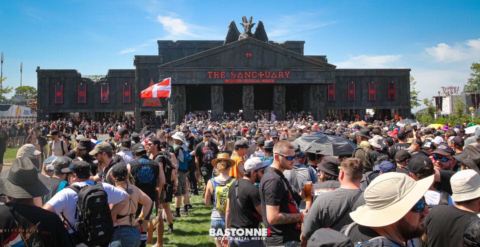 Dès notre arrivée sur site, pour l’équipe Bastonne!, plusieurs améliorations nous sautent aux yeux : cette passerelle (alors oui, elle était peut-être déjà là l'année précédente, mais nous non ! ) qui nous mène vers la pose bracelet. Là, nous sommes accueillis par un énorme brumisateur, et des bénévoles équipés de pistolets à eau, afin de parer, tant bien que mal, aux premières chaleurs matinales ; bien-sur, je fais tout pour les éviter car j’ai du matériel et que je n’ai pas spécialement envie de passer, avec, sous la flotte ! Devant nous, se dresse la magistrale et sublime Gardienne des Ténèbres ! Elle a trouvé sa place dans un espace spécialement conçu pour elle ; un parvis entièrement repensé et où l'antre de cette Gardienne , " la Porte des Ténèbres ", se situe au centre de la pose bracelet des festivaliers ! On ne voit qu’elle et pour cause, ce projet, dont nous avions eu un retour en conférences de presse trois-quatre ans plus tôt, est maintenant concret ! J’ai encore en ma possession les documents de ce projet et la voir là, immense, d’un air fier, attendant notre arrivée, c’est beau ! La circulation piétonne est fluidifiée grâce à un aménagement des allées latérales ; les stands de restauration sont repensés avec d'avantages d’espaces ombragés ; exit le " British bus " et autres food-trucks ! Pour se restaurer sur le site, il faut se diriger vers le Metal Corner, où les bars et les points repas sont installés. La zone ombragée, prise d'assaut tout au long de la journée, offre un doux moment de répit, où des transats, salutaire pour les festivaliers, sont mis à disposition. En lieu et place de la feu " FanZone ", on découvre une nouvelle scène : la Purple House ! Cette scène a été pensée comme un ring musical où s'exécuteront, guitaristes, artistes, groupes... Elle est placée au centre de cette " boîte noire immersive " permettant aux curieux de déambuler tout autour.