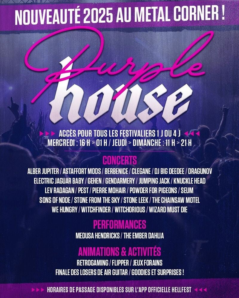 Cette entrevue bouclée, je poursuis ma déambulation vers la Purple House pour en découvrir le concept ! De chaque côté de l'entrée il y a un bar : qu'elle riche idée de ne pas rester enfermé ! Je m'enfonce dans l'entrée, et c'est assez original, car j'ai l'impression, avec tout ce noir, de pénétrer, à la fois , dans une discothèque et... une tente Quechua (vous savez, les noires, celles qui te protègent de la lumière et du soleil ! Bref, les campeurs comprendrons ! ... ). Au milieu, une cage grillagée est posée, et à l'intérieur s'exécutera un groupe, un duo, une animation... C'est là que Matthieu (champion galactique de Air Guitar, animateur de la spécialité sur les Warm-Up du Hellfest mais pas que...) a départagé les Losers de Air Guitar 2025, tout un programme !