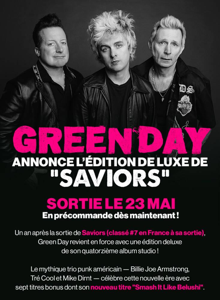 Le mythique trio punk américain Green Day, Billie Joe Armstrong, Tré Cool et Mike Dirnt, annonce la sortie d'une édition deluxe de son quatorzième album studio, "Saviors". Un an après la sortie de "Saviors" (classé #7 en France à sa sortie), le groupe revient en force avec cette nouvelle version enrichie de sept titres bonus, incluant leur nouveau titre 'Smash It Like Belushi'.