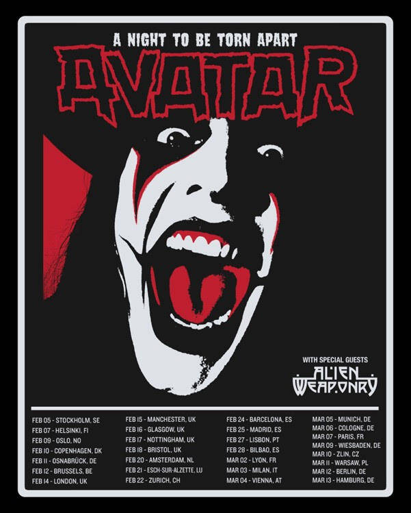 Ce concert exceptionnel donnera un premier aperçu de l'étonnante nouvelle production live d'AVATAR prévue pour cette cette tournée mondiale 2026 qui verra Johannes Eckerström (chant) mener sa troupe de guerriers John Alfredsson (batterie), Jonas Jarlsby (guitare), Henrik Sandelin (basse) et Tim Öhrström (guitare) à travers tous les continents. Mêlant ancien et nouveau répertoire, ces shows présenteront AVATAR comme vous ne l'avez jamais vu. Sur certaines dates, comme le 7 mars 2026 au Zénith de Paris, ils donneront certains des plus gros concerts de leurs 25 ans de carrière. Un autre spectacle mémorable se déroulera le soir de la Saint-Valentin, à Londres, dans une toute nouvelle salle, The Exhibition, un lieu impeccablement restaurée sur murs d'une usine victorienne à White City, un lieu unique dévoué à la musique et de culture au cœur de l'ouest de la capitale britannique.