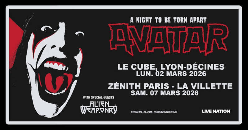 La prochaine tournée européenne d'AVATAR, en tête d'affiche, passera par Le Cube à Lyon , le lundi 2 mars, puis par le Zénith de Paris La Villette le samedi 7 mars 2026. Préparez-vous à des nuits où le groupe va tout déchirer, et durant lesquelles il offrira un tout nouveau spectacle aussi dramatique que diabolique ! Le coeur noir et battant le quintette sera plus extravagant et flamboyant que jamais et ce pour le plus grand plaisir du public.