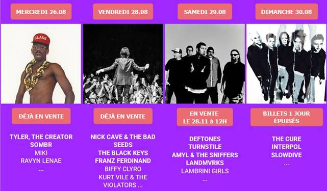 Épuisés : billets jour dimanche 30 août, pass 2 jours (ven./dim., sam./dim.) et pass 3 jours