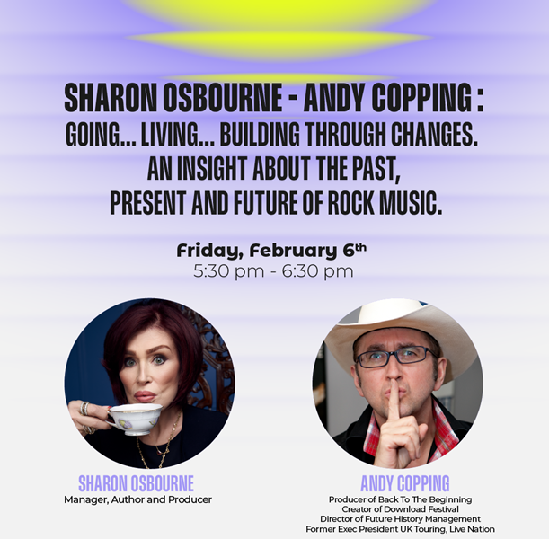 Sharon Osbourne et Andy Copping, deux figures majeures du management et de la production de concerts et festivals, partageront leur vision le vendredi 6 février 2026, au Palais des Festivals de Cannes.